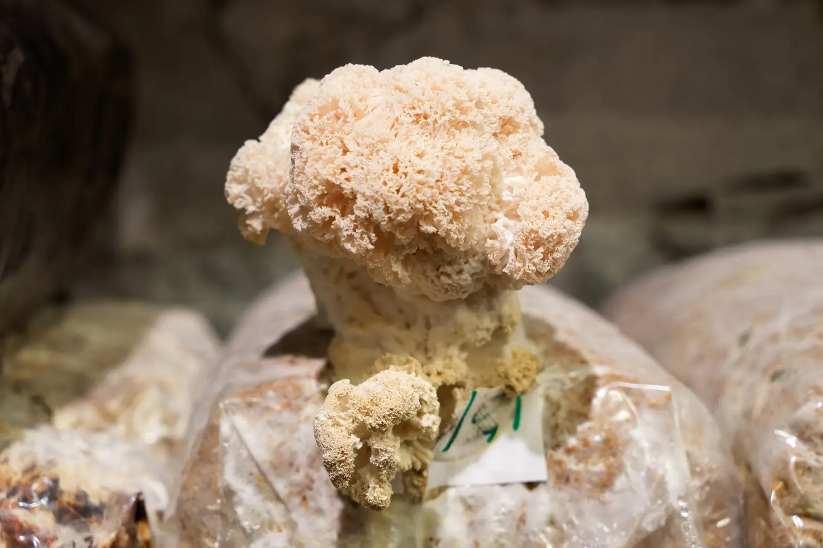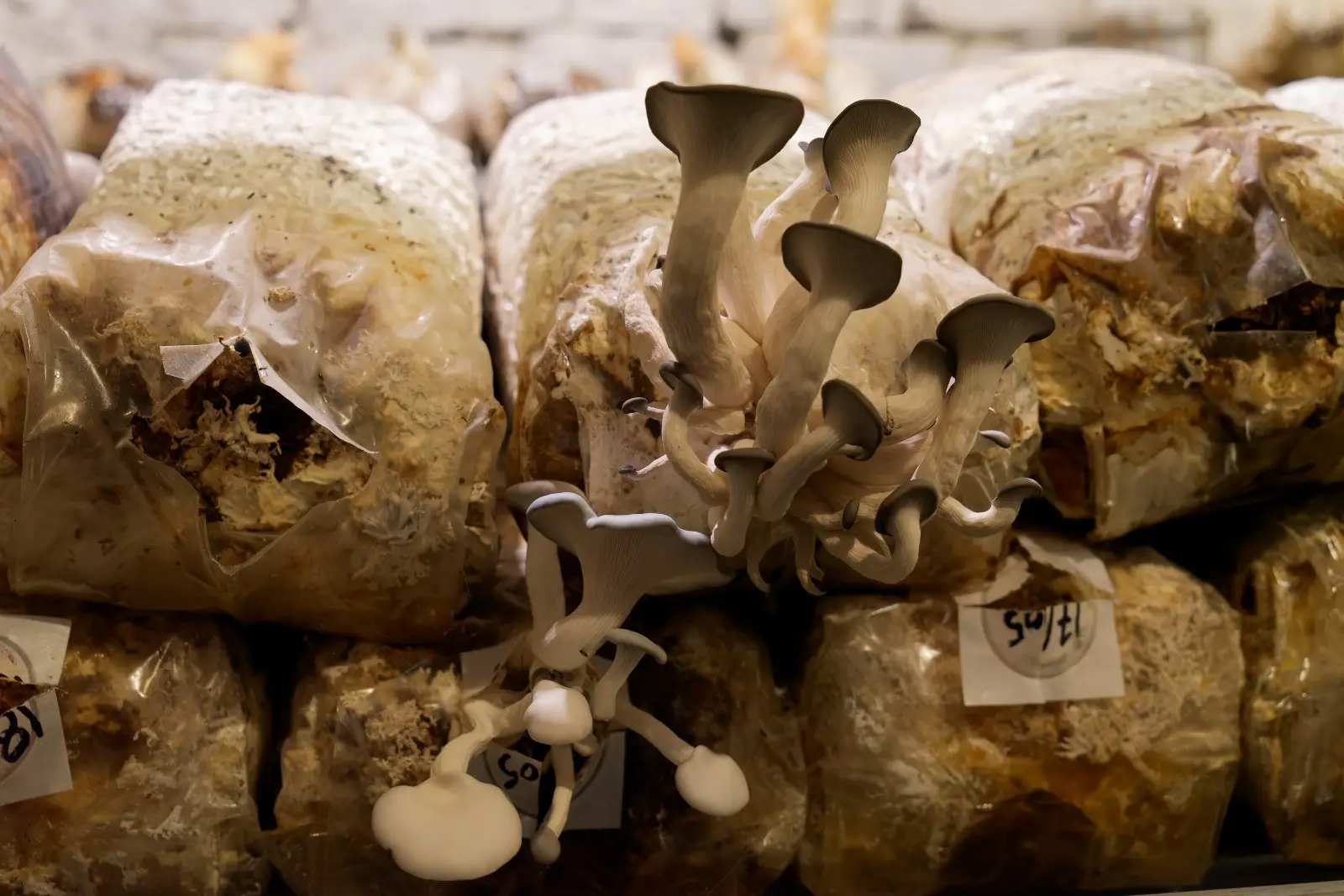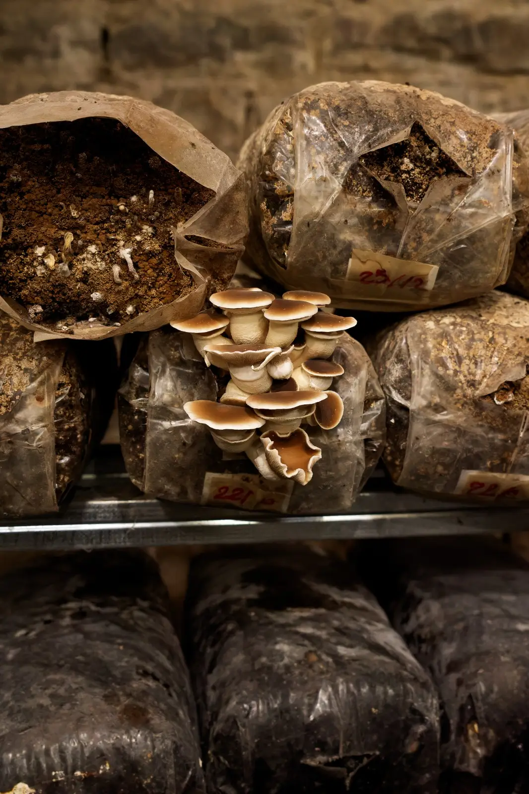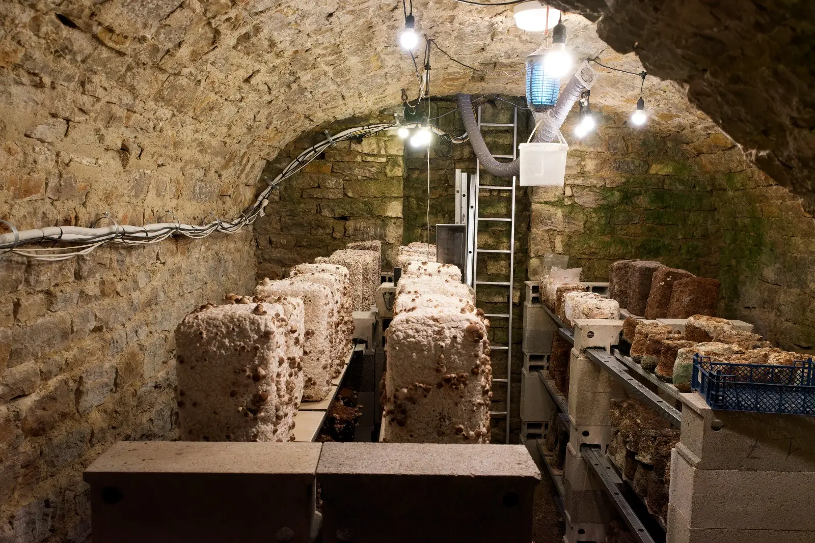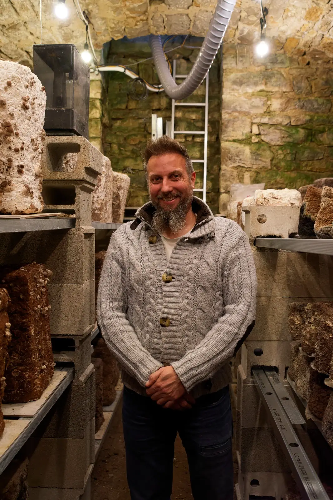 Florian Da Rom cultive avec soin différentes variétés de champignons, parmi lesquelles pleurotes gris et Black Pearl, hydne hérisson, ainsi que des variétés saisonnières comme le shiitaké ou le strophaire rouge-vin.