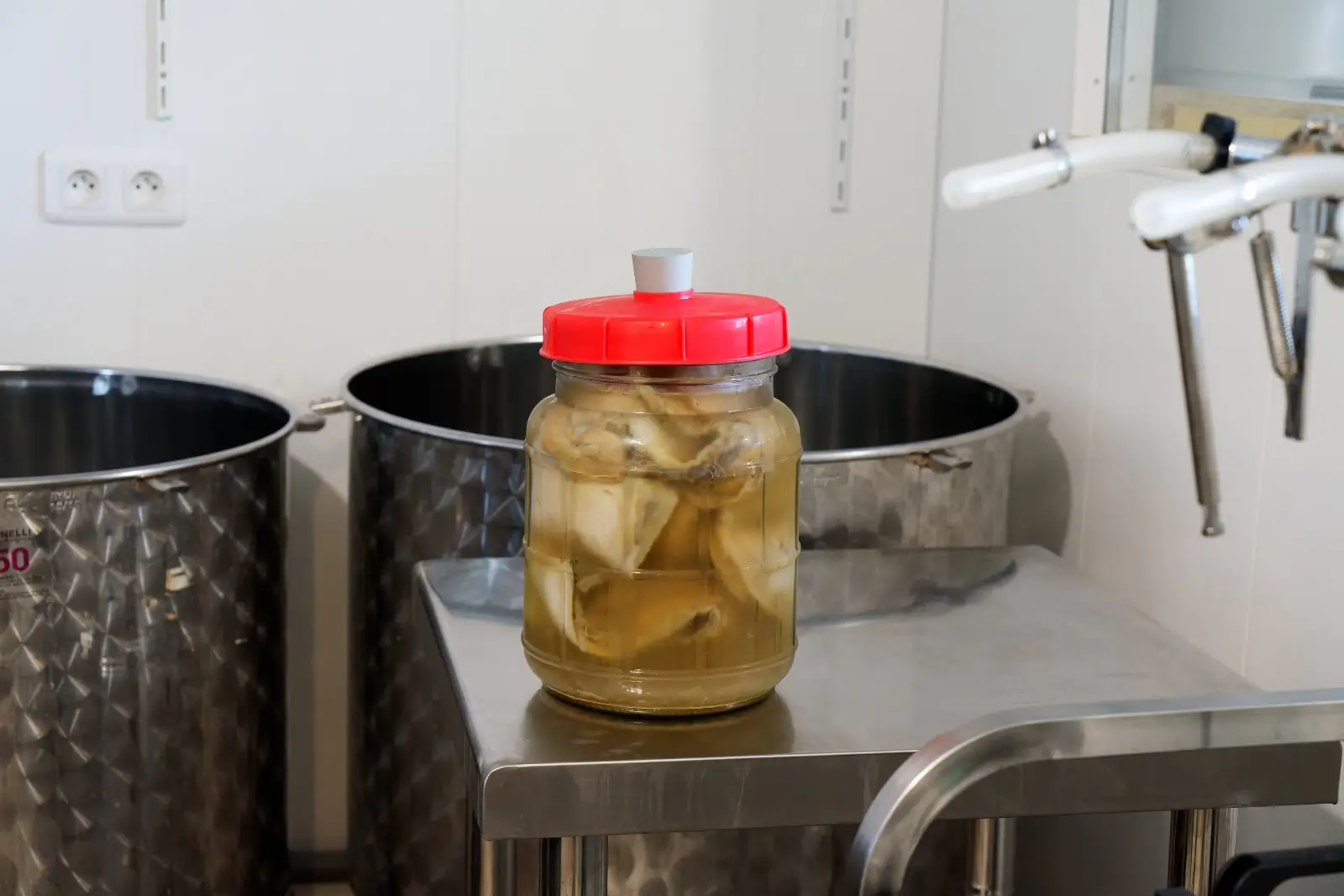 La production commence par une infusion du thé pendant une bonne heure, la mère de kombucha (photo 2) est alors ajoutée. Agissant comme le levain du pain, elle permet une fermentation qui va durer 12 jours dans des cuves en inox. La boisson passe ensuite dans des cuves d'aromatisation pendant une journée. Ici, ce sont des fruits sous forme de jus qui sont ajoutés, pour éviter une trop grande fermentation.